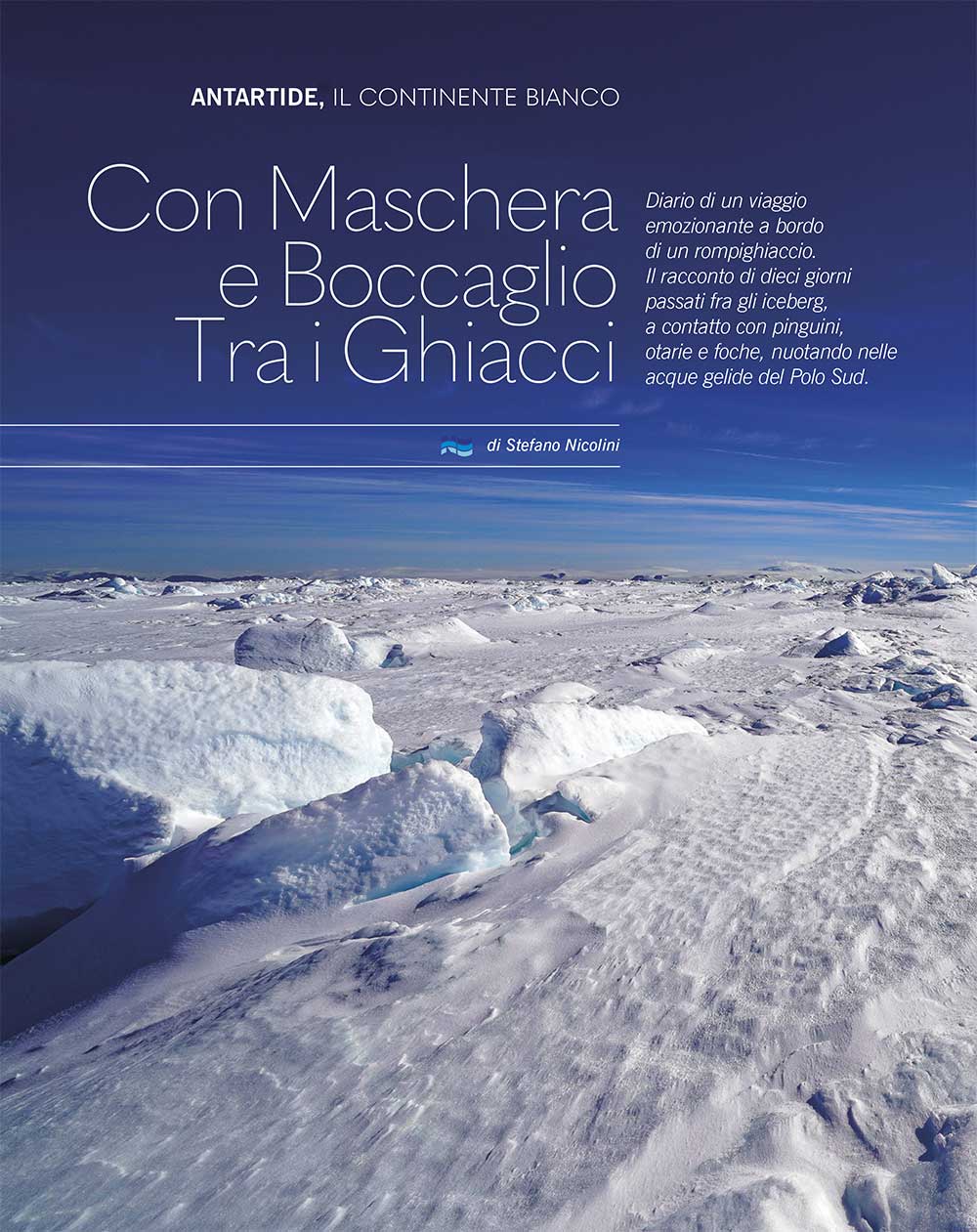 Diario di un viaggio emozionante a bordo di un rompighiaccio. Il racconto di dieci giorni passati fra gli iceberg, a contatto con pinguini, otarie e foche, nuotando nelle acque gelide del Polo Sud.
